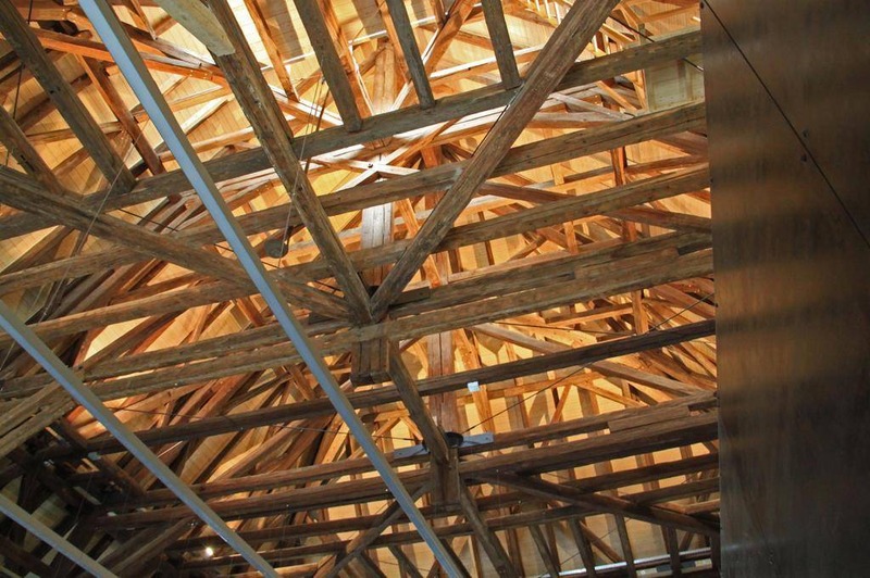 Die Grundstruktur der ehemaligen Kelter als stützenfreier, nahezu quadratischer Raum (20m x 17m), überbaut mit dem markanten mächtigen Walmdach (16m Firsthöhe) und im Innenraum bis zum First sichtbarer historischer Holzkonstruktion des 18. Jahrhunderts, ist vollständig erhalten geblieben. Nur schadhafte Hölzer wurden ersetzt und dabei auf die klassischen Verbindungstechniken des Zimmerhandwerks, wie Zapfen, Blatt und Holzdübel besonderen Wert gelegt.
