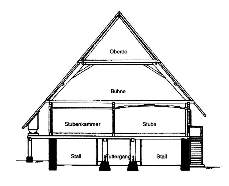 Die Decken der Stube und Schlafkammer sind niedriger gehalten, als das die Wandständer zulassen würden. So entsteht ein ca. 40 cm hoher Zwischenraum zwischen der Stuben- und Kammerdecke und dem darüber liegenden Bühnenboden. Dieser Zwischenraum wird Nussbühne, Stubenbühne, Rutschbühne oder auch - da der Rauch der Küche durch diesen Raum ins Freie strich – Rauchbühne genannt. Er wurde zum Trocknen von Nüssen oder zum Aufbewahren von Arbeitsgeräten genutzt.