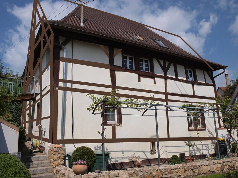 Ostfassade mit Eintrag des ehemaligen Fachwerkgiebels  / Fachwerkhaus in 79346 Endingen (13.04.2016 - Frank Löbbecke)