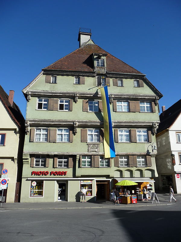 Großes, viergeschossiges Gebäude, bestehend aus einem zweigeschossigen massiven Unterbau und darauf abgezimmerten Fachwerkgeschossen, nach oben hin abschließendes, viergeschossiges Satteldach mit einem großen Krüppelwalm in Richtung Marktplatz und einem kleinen Krüppelwalm an der Nordseite.