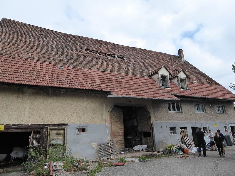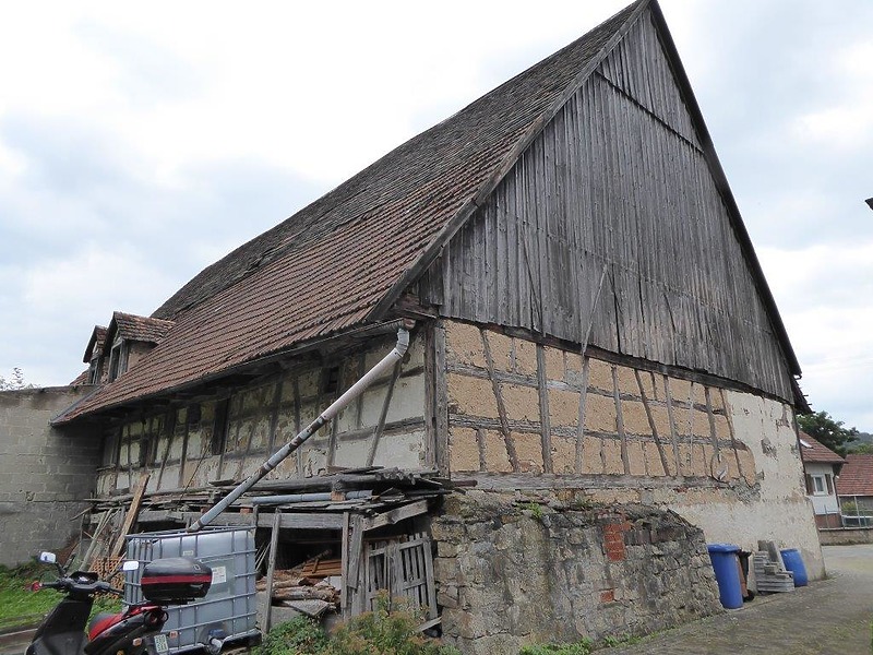 Das gesamte Gebäude ist in einem weit fortgeschrittenen Zerfall begriffen, was äußerlich in einem großen Loch in der Dachhaut oberhalb der Tenne augenscheinlich wird. Dort haben an einer ausgedehnten Schadstelle die Latten nachgegeben und zum Abrutschen der Deckung geführt. Solche Schadstellen durch über lange Zeit eindringendes Regenwasser sind mehrfach vorhanden und ziehen sich durch alle Geschosse. Eine davon liegt im Bereich der Haupttreppe, wodurch Obergeschoss und Dachraum nicht mehr betretbar sind. Hinzu kommen die üblichen Schäden durch die Stallnutzung in gleich zwei Querzonen. Angesichts des Umfangs und der Intensität der Schadstellen ist die Bausubstanz in größerem Umfang geschädigt.