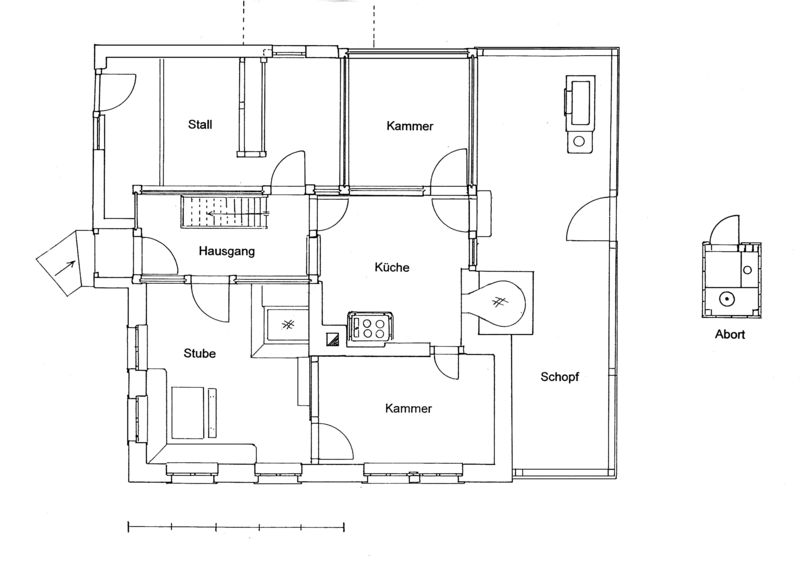 unter einem Dach Wohnung, Stall und Wirtschaftsräume. Der Wohnteil liegt zum Tal hin, der Stall zur Bergseite. Der Brunnen mit Milchhäuschen befindet sich im angebauten Schopf, der über die Küchentür direkt mit dem Haus verbunden ist.