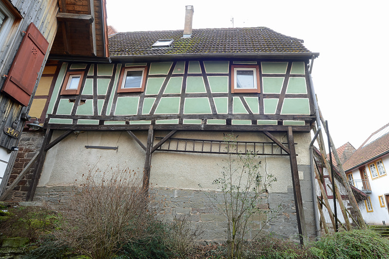 Das Gebäude befindet sich in einem schlechten baulichen Zustand. Insbesondere die Aufstockung des OG ist durch unterdimensionierte horizontale Eichenbalken mit weiten Auskragungen gekennzeichnet. Die überlasteten Auskragungen sind an vielen Stellen gebrochen und wurden bereits ab der Mitte des 20. Jahrhunderts nord- und südseitig mit einer Stützkonstruktion verstärkt. Der Westgiebel ist ebenfalls durch statische Überlastung des Stichgebälks und wohl auch durch durch Feuchteschäden an der OG-Schwelle bis zum Teileinsturz geschädigt. Zudem zeigt sich an der massiven EG-Westwand eine durchgängige Setzung, die zu einer erheblichen Neigung des Wandstücks nach Westen hin geführt hat. Insgesamt ist der Westgiebel als labil bis instabil zu betrachten, und wird nur durch die umfangreichen Sprießungen und Verschalungen dort halbwegs stabil gehalten.