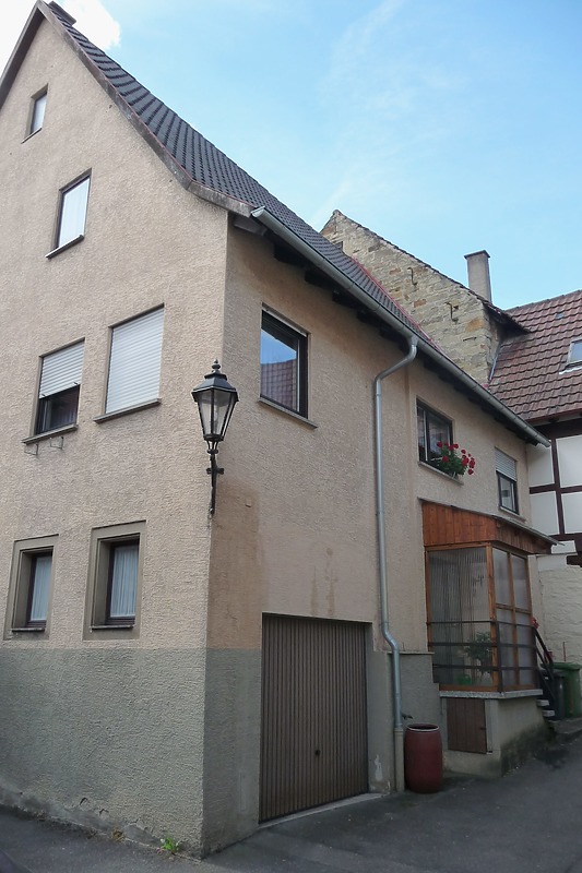 Zweistöckiges Wohnhaus im "Deutschen Hof", teils Fachwerk und teils massiv gebaut, mit massivem Erdgeschoss, Gewölbekeller und Giebeldach; Vorbau. (a)