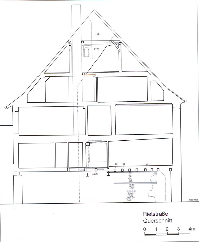 Am Westgiebel wurde die gleiche Bauabfolge wie im Osten erkannt. So wurde auch hier auf einer älteren, in diesem Fall dem Haus Rietstrasse 28 zuzuschreibenden Giebelscheibe nachträglich aufgemauert. Anders als am ältesten Gegengiebel ist hier jedoch eine nach Westen orientierte Belichtungsöffnung vorhanden. Sie befindet sich mittig unter dem alten Firstpunkt und sitzt ohne Störung im Verband. Die im Dachinnern in Haustein gefasste Öffnung weist eine lichte Höhe von 63 cm auf, wobei die Breite von 32 cm durch einen 6 cm starken Steinsturz überbrückt wird. Zum Zeitpunkt der Untersuchung war die Öffnung bis auf eine Resthöhe von 34 cm zugemauert. Das im 2. Dachstock erkannte Giebelprofil ließ sich bis in den 1. den Dachstock verfolgen. Hier konnte im Bereich der in den 2. Dachstock führenden Blockstufentreppe ca. 30 cm unter der Kehlbalkenlage des vorhandenen Daches der alte Traufpunkt und dazu in vertikaler Abstimmung die nördliche Traufwandflucht als Abbruchkante aufgenommen werden. Bei der ältesten erkannten Giebelscheibe handelt es sich demnach um eingekapptes Pultdachprofil, wie es letztlich aus der am Ostgiebel angetroffenen Befundlage auch für den Gegengiebel rekonstruiert werden kann.