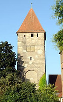 Dreistöckiger Torturm über annähernd quadratischem Grundriss mit spitz zulaufendem Zeltdach.
