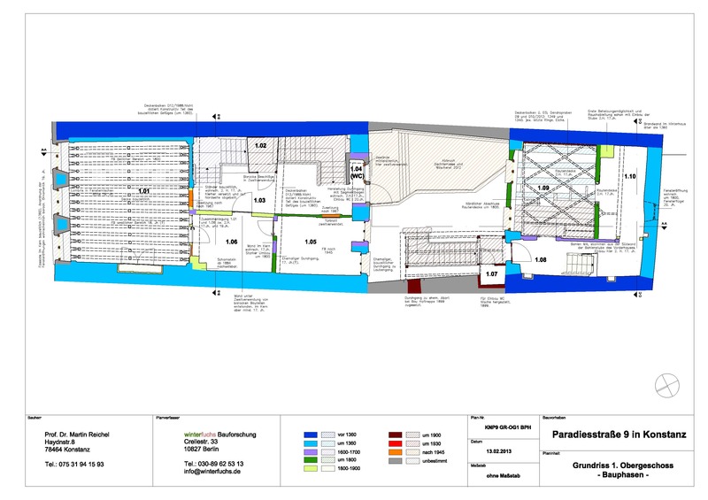 Dachwerk Vorderhaus und weitere Hölzer 1338-40 (d), Dachwerk Hinterhaus 1355/56 (d). Errichtung beider Gebäude (inkl. Bohlenstube 1. OG VH) in ihrer heutigen Kubatur weitgehend unter Nutzung der nachbarlichen Brandwände und möglicherweise anstelle von Vorgängerbauten.