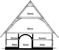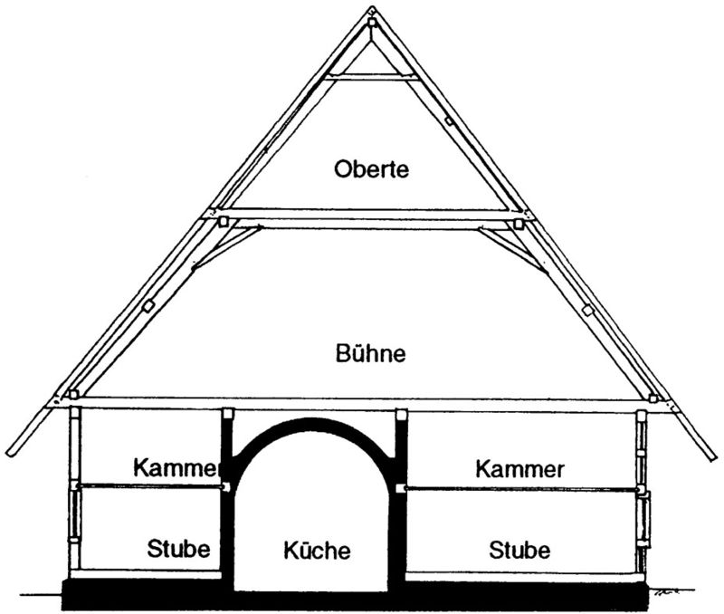 Im Erdgeschoss liegen Stube, Küche, Stüble, ein quer zur Firstrichtung durchlaufender Hausgang, drei Kammern, Stall und zwei Keller.
