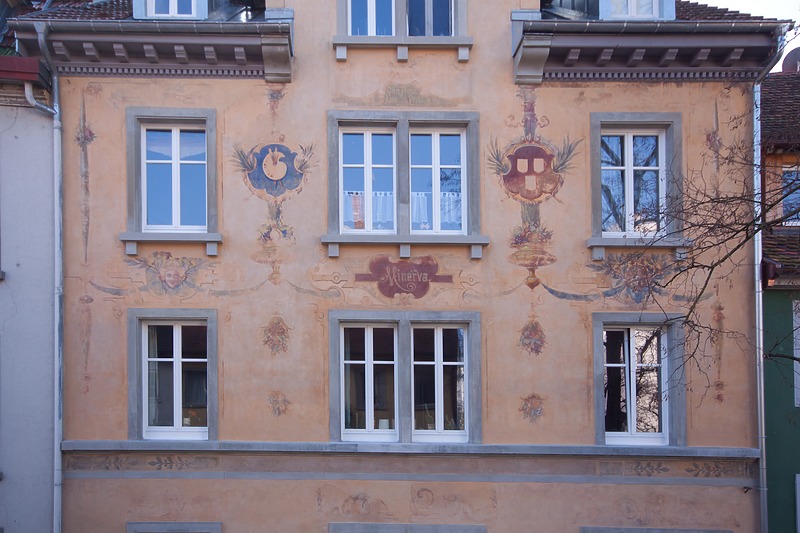 Fassade mit reicher Malerei auf ockerfarbenem Grund in der sog. Keim'schen Mineraltechnik, mit Motiven im Stil der römischen Wandmalerei mit mythologischem Themenrückgriff und Phantasieornamenten.