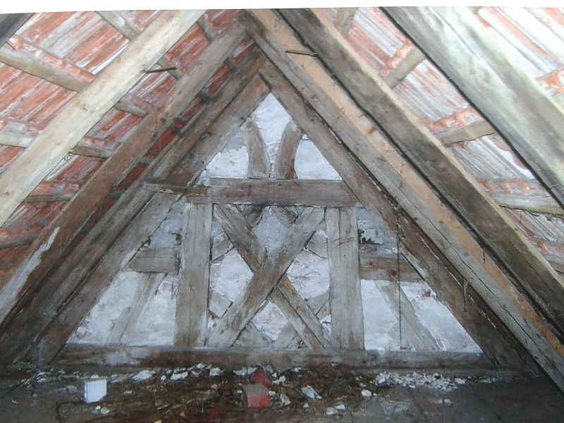 Danach war das Dachwerk zwischen zwei Massivgiebeln abgezimmert. Am Ostgiebel lagen zwei Dachkammern. Ehemals getrennt durch eine mittige Fachwerkwand erstreckten sie sich über zwei Dachzonen. Die Zugänge lagen seitlich der Mittellängswand. Eine weitere, heute noch vorhandene Kammer liegt im westlichen Dachabschnitt und nimmt innerhalb des nördlichen Dachabschnittes den Raum von insgesamt drei Dachzonen ein. Den verbleibenden Rest nimmt der Dachraum mit den beiden Treppenläufen ein. Der 2. Dachstock blieb ungeteilt und diente als Schüttboden. Für die Zeit um 1525 (d) waren wohl beide Giebel als Staffelgiebel angelegt.