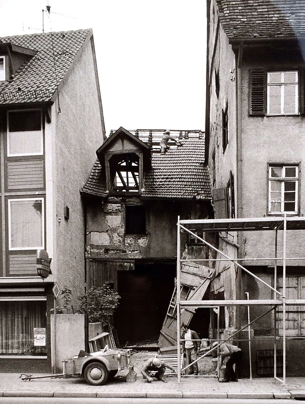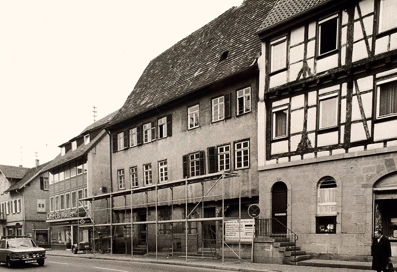 Neubebau errichtet 1975 nach Abbruch eines Wohn- und Geschäftshauses aus dem 18. Jahrhundert und einer dazugehörenden Scheuer (hinter dem Haus).