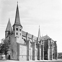 An dessen Stele erhebt sich heute der 1269 begonnenen hochgotische Neubau. An eine dreischiffige Basilika von vier Jochen schließt sich ein einschiffiges Querhaus an, dessen Vierung sich zu einem polygonal abgeschlossenen Chor öffnet. Ihn flankieren zwei unvollendete Türme. Den äußeren Jochen der Querhausarme sind östliche polygonale Seitenkapellen angefügt. Die so entstehende Dreiapsidenanlage war zur Zeit ihrer Errichtung als Chortypus bereits so veraltet, dass sie wohl nur als Reminiszenz an den niedergelegten Vorgängerbau verstanden werden kann.