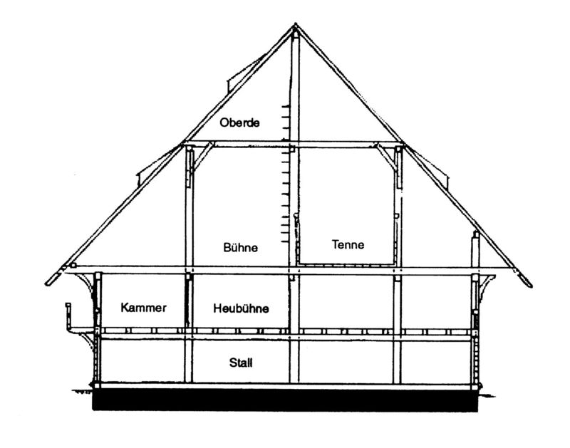 Das Haus wird von der Traufseite durch insgesamt fünf Eingänge erschlossen, wovon die rechten drei in den Stall führen. Durch den mittleren Eingang betritt man den Futtergang. Durch eine Öffnung in der Decke des Futtergangs, das Heuloch, wurde das Heu vom darüber liegenden Heustock heruntergeworfen. Im linken Stall standen die Milchkühe und Kälber. Jungvieh, Rinder, Ochsen und Pferde waren im rechten Stall untergebracht.