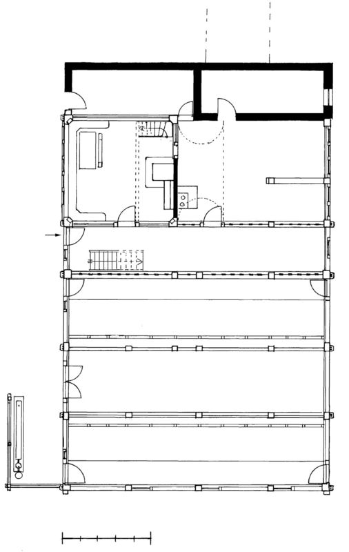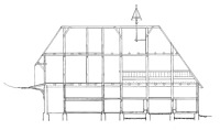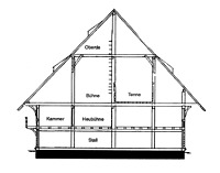 Das Haus steht senkrecht zur Falllinie des Hanges. Über die bergseitig gelegene Hocheinfahrt konnte der Bauer mit den beladenen Heuwagen direkt in den Dachraum einfahren und das Heu nach unten auf den Heustock entladen. Im geräumigen Dachgeschoss werden die Ausmaße des Hauses sowie die hohe Baukunst dieser Haus- und Dachkonstruktion ersichtlich.