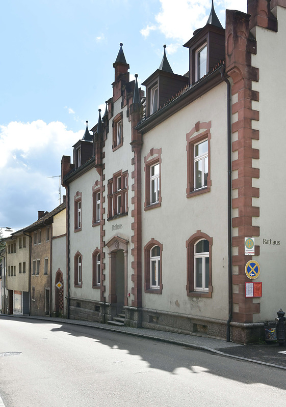 In den Mittelachsen der Traufseiten befinden sich je ein Eingang zum Rathaus. Der Haupteingang über die Schlossstraße an der Nordostfassade ist dabei mit einem Risalit mit Zwerchhaus hervorgehoben. Rückwärtig in Richtung Südosten ist dem Gebäude ein Erker angegliedert, der von der Geländeoberkante über beide Vollgeschosse aufragt und mit einem Pultdach an die Außenwand des Hauptbaus anschließt. Achsmittig im ersten Obergeschoss der Nordwestfassade befindet sich ein Ziererker, der sich zum Vorplatz in Richtung Hanglage präsentiert. Das Satteldach des Hauptbaus ist in Nordwest-Südostrichtung ausgerichtet. Die Traufe ist als einfache flache Kastentraufe aus Holz ausgeführt. Das Dach ist mit einem Falzziegel eingedeckt. Beide Giebelfassaden sind mit Staffelgiebeln mit Zinnen ausgeführt, an welche die Dachflächen rückseitig anschließen. Die Dachlandschaft ist geprägt von unterschiedlichen Gauben, sowie dem an der Nordostfassade hervortretendem Risalit mit Zwerchhaus. Vier Gauben reihen sich entlang den Fassadenachsen der Nordostfassade. Die Gauben sind einheitlich gestaltet. Jede besitzt ein Zeltdach mit bekrönender Metallkugel.