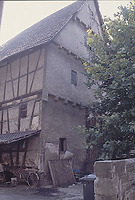Ehemals giebelständige, zweistöckige Fachwerkscheuer (verputzt) mit Segmentbogentor, Auskragungen und Knaggen. Eine Scheuer im Bereich Pfarrgasse 1 wird im Lagerbuch des Jahres 1569 erstmals genannt. Diese gehörte ursprünglich zur Hofreite des benachbarten Wohnhauses Kirchstraße 42. Eine Bebauung des Bereichs Pfarrgasse 1 und Kirchstraße 42 ist mindestens schon Ende des 15. Jahrhunderts vorhanden, wie aus dem ältesten erhaltenen Lagerbuch hervorgeht. (a)
