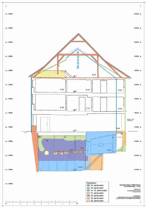Bauphasenplan, Längsschnitt (C) Universitätsstr. 6 (Vorderhaus) / Haus „Zum Langen Spieß“ (Haus A) in 79098 Freiburg, Altstadt (27.11.2008 - Bearbeiter: F. Löbbecke, Plangrundlage: strebewerk)