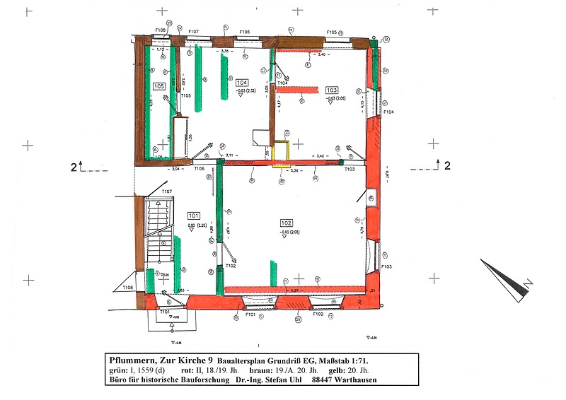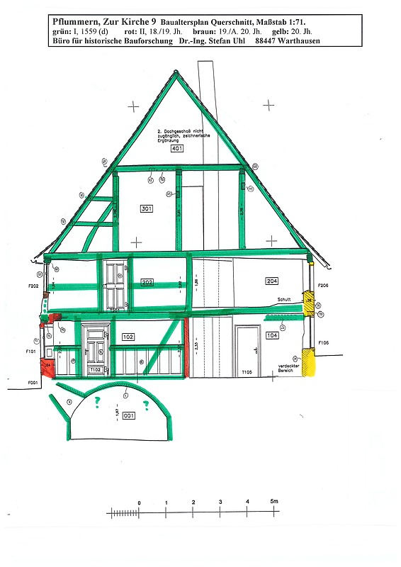 Wohnteil eines Wohnstallhauses aus dem 17. Jahrhundert. Kernbestand um 1659 (d) errichtet. Im 18. und 19. Jahrhundert wurde der Erdgeschossbereich sehr umfangreich erneuert, in Obergeschoss und Dachwerk erfolgten damals nur geringe Eingriffe. Im 19. und frühen 20. Jahrhundert wurden nochmals sehr umfangreiche Veränderungen an der rückseitigen Außenwand und der Trennwand zum einstigen Wirtschaftsteil vorgenommen.