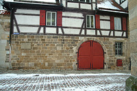 - Das Kellertor wurde vermauert und von Innen mit einer Fassbodenattrappe verdeckt.