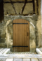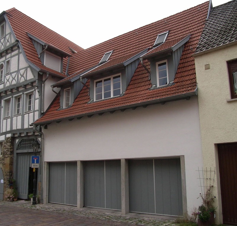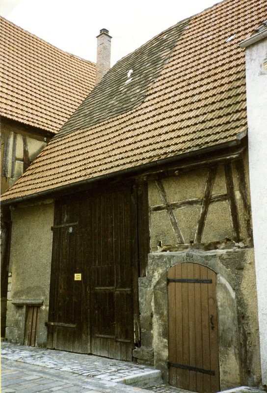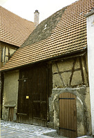Einstöckige, traufständige Fachwerkscheuer auf Massivsockel, mit Kellergewölbe und Giebeldach, und mit ehemaligem Rundbogen Kellerabgang, bezeichnet mit der Jahreszahl "1555" und dem Handwerkszeichen eines Weingärtners (ein "Hapmesser" bzw. eine "Pfahlhape"). (a)