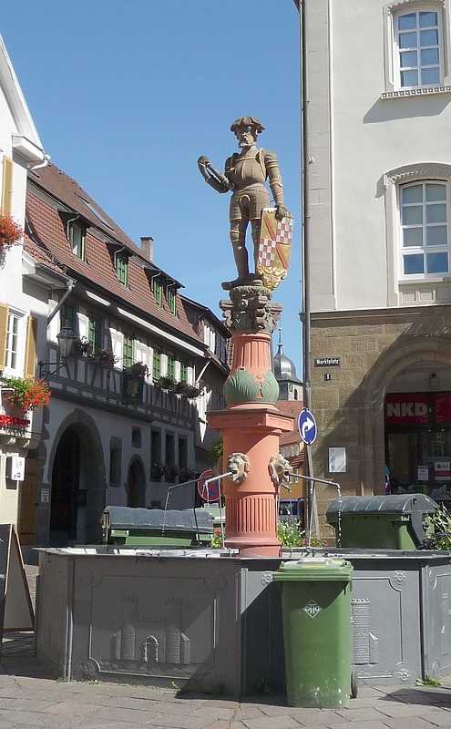 Vierröhriger Brunnen mit achteckigem Brunnentrog (acht gusseisernen Platten mit dem Wappen der Stadt Besigheim). Lebensgroße steinerne Brunnenfigur (Ritterfigur mit Schild ) als Schildhalter mit Wappen der Markgrafschaft Baden (Schrägbalken für die Markgrafschaft Baden, Rauten für die Grafschaft Sponheim). Brunnenfigur aus der ersten Hälfte des 16. Jahrhunderts, heutige Figur Nachbildung von 1976.