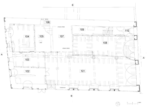 Das Erdgeschoss ist eine zweischiffige Anlage. Die Lasten der oberen Geschosse Ruhen auf einer mittigen Stützenreihe. Die Raumaufteilung könnte aus einer Umbauphase stammen. Die Räume des 1. Obergeschosses sind U-förmig um die Erschließungszone angeordnet. Im 1. Dachgeschoss gliedert und erschließt ein zentraler Flur das dreischiffige Stockwerk.