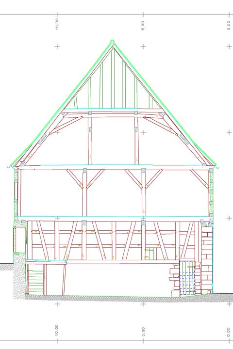 Die beiden südlichsten Zonen waren vor dem Umbau 1852 als weitere Tenne (Zone 2) sowie als weitere Fruchtkammer (Zone 1) eingerichtet.