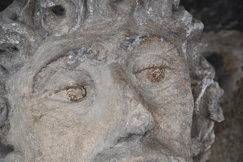 Der Bart ist nicht hinterschnitten, was wiederum zu den Anzeichen für eine ursprüngliche Konzeption für die frontsichtige Betrachtung spricht. Der tiefe Einschnitt des Mundes sowie die expressiven, tief eingegrabenen Gesichtsfalten sprechen für eine größere Entfernung des Betrachters von der Figur.
