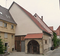Zum Teil verputzte Fachwerkscheune mit Gewölbekeller, Satteldach, Rundbogentor des Kellereinganges vorkragend, Fachwerk teilweise verblattet, Holztor mit Beschlägen des 16. Jahrhunderts, im Kern Mitte 16. Jahrhundert; dahinter angrenzend innere Stadtmauer (Kulturdenkmal), um 1220/30.