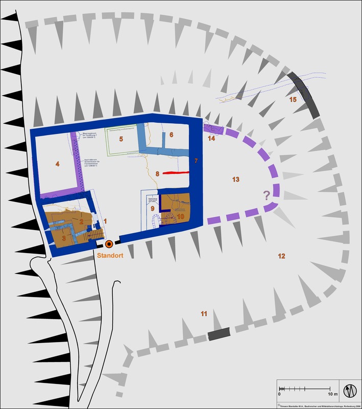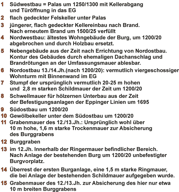 vermutlich in gleicher Zeit eine umfassende Sanierung. In das 14.Jahrhundert scheint auch der Einbau eines Gewölbekellers innerhalb des Südosteckbaus zu gehören, wie das zugehörige Fundmaterial nahelegt. Im Jahre 1504 wurden unter Herzog Ulrich die Burggebäude mutwillig zerstört.