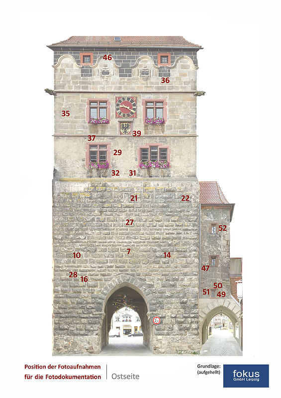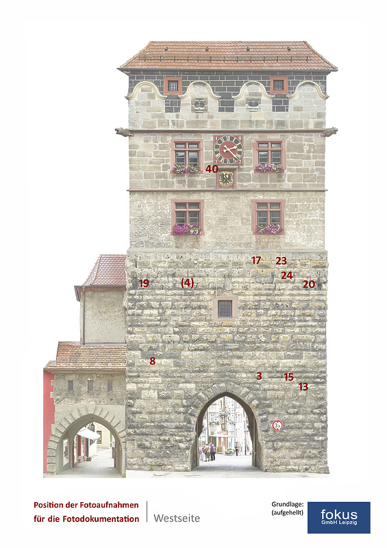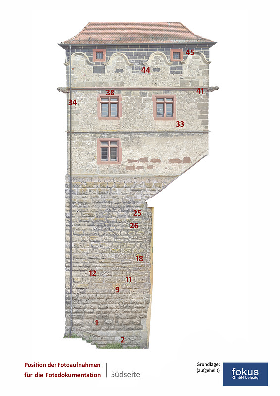 Die Suche unter den erhaltenen Anstrichresten war nur an einer Stelle auf der Südseite erfolgreich, wo über dem westlichen Fenster des 2. Oberbaugeschosses ein vertikaler weißer Strich der schwarzen Farbe aufliegt. Da er angesichts der sonst so fragmentierten Befunde auffallend gut erhalten ist, ist die Interpretation mit Zweifel verbunden. Dessen ungeachtet ist der Strich auf den Fotografien von 1972 wiederzufinden, wenn auch nicht an gleicher Stelle, denn beim Austausch der Gewändesteine wurden die dem Sturz aufliegenden Quader herausgenommen und in geänderter Lage wieder eingebaut. Der betroffene Stein hatte seinen Platz zuvor in der Mitte, liegt seither aber nach links verschoben und auf den Kopf gedreht. Da ein monochromer, durchgehend schwarzer Anstrich kaum denkbar erscheint, darf trotz fehlenden Nachweises davon ausgegangen werden, dass alle Anstriche mit einem hellen Fugennetz kombiniert waren. Hinter der östlichen Uhrentafel können aufschlussreiche Befunde hierzu erwartet werden.