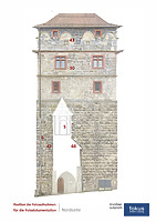 Zur Gewinnung weiterer Daten zur Baugeschichte des Turms wurden früher schon zweimal Holzproben entnommen und dendrochronologisch ausgewertet. 1994 wurde festgestellt, dass die Balkenlagen über der Tordurchfahrt und über dem 1. Oberbaugeschoss 1638/39 zu datieren sind, Hölzer der Blockwände einer Zelle im 2. Oberbaugeschoss 1704/05 datieren und die Hölzer für das Dachwerk im Winterhalbjahr 1705/06 geschlagen worden sind (Burghard Lohrum, Dendrochronologische Datierungen 1994). Nachdem es durch die Umwandlung der Oberen Hauptstraße zur Fußgängerzone erstmals möglich war eine Leiter in der Tordurchfahrt aufzustellen, konnten 1996 die beiden Torbalken in der Durchfahrt, in denen die Tore einst gelagert waren, beprobt werden, die wegen Fehlens von Waldkanten eine Datierung in den Zeitraum 1242±2, d.h. 1240 bis 1244, erlaubte (Burghard Lohrum/ Stefan King, Dendrochronologische Datierungen 1996). Im Rahmen der vorliegenden Untersuchung wurden weitere Proben entnommen, um eine Lücke in der Bauabfolge der archivalischen Recherchen von Werner Wittmann zu füllen. In Frage stand die Entstehungszeit der Zelleneinbauten im 3. Oberbaugeschoss, die mit Hilfe der Dendrochronologie um 1812 datiert werden konnten. Darüber hinaus waren im 2. Oberbaugeschoss ein freistehender Ständer aufgefallen, der ganz versteckt nur durch den Uhrenkasten einsehbar ist, sowie ein ebenfalls nur eingeschränkt zugänglicher, west/östlich gespannter Unterzug, dessen einst aufliegende Balkenlage nicht mehr vorhanden ist. Ständer und Unterzug wären sicherlich bereits 1994 beprobt worden, wurden damals aber offenbar übersehen. Nach Lage der Dinge ist zu vermuten, dass sie 1639 eingebracht worden waren. Mit der Entnahme sollte dies nachgewiesen werden, doch gelang eine Datierung nicht.