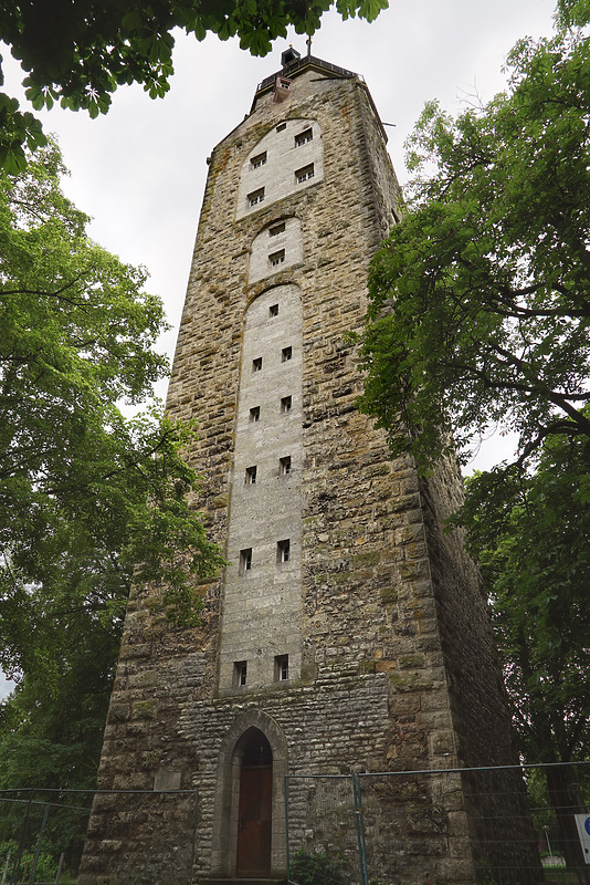 Turm von 54 m Gesamthöhe, davon 37 m Höhe bis zur Mauerkrone des Aufsatzes mit Umgang. Das Dach bildet heute ein Spitzhelm, die Mauern bestehen hauptsächlich aus Buckelquadern.