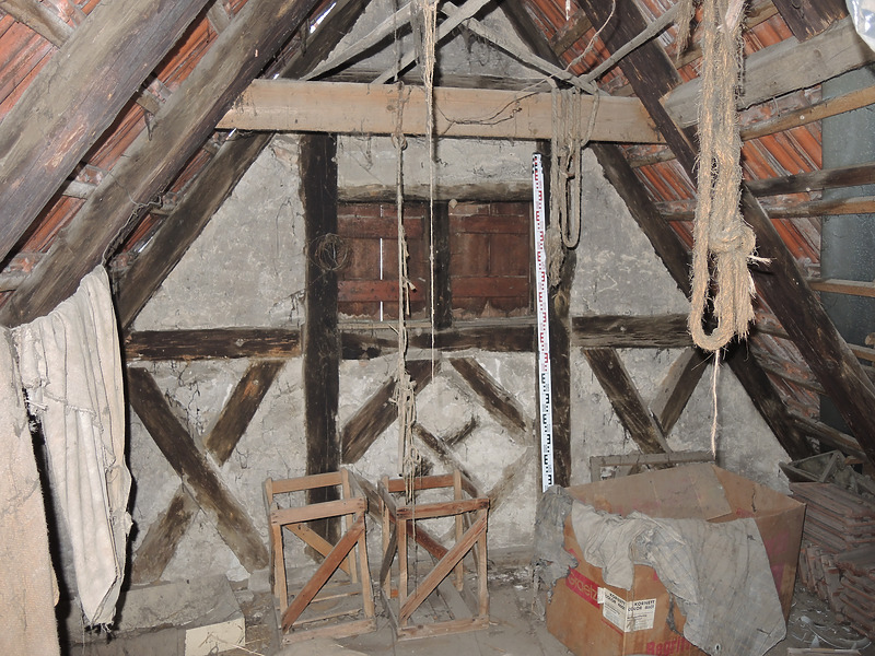 mit verzapften Holzverbindungen zusammengefügt. Lediglich die Sparren scheinen aus Nadelholz (Tanne) zu bestehen. Die Sparren im 2. Dachgeschoss zeigen eine Rußschwärzung, was auf ein ehemals offenes Rauchdach hindeutet. Am südöstlichen Giebel des 2. Dachgeschosses sind von innen Fachwerk-Zierelemente in den Brüstungsbereichen zu erkennen. Diese Andreaskreuze und Rautenmotive deuten auf eine ehemals unverputzte Fachwerkfassade hin.