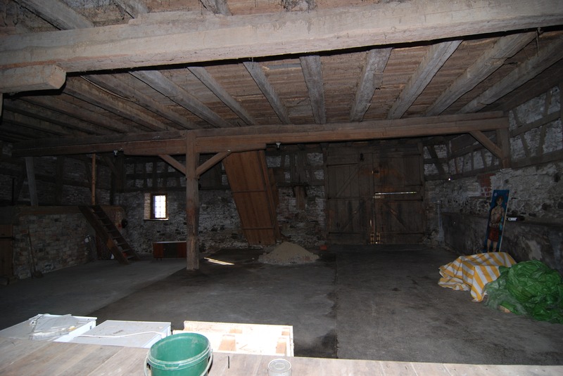 Beleg dafür ist das in der Küche heute einsehbare westliche Wandrähm des Erdgeschosses. Es zeigt auf der Unterseite Zapfenlöcher für Wandständer und Wandstreben einer einstigen Fachwerkwand.