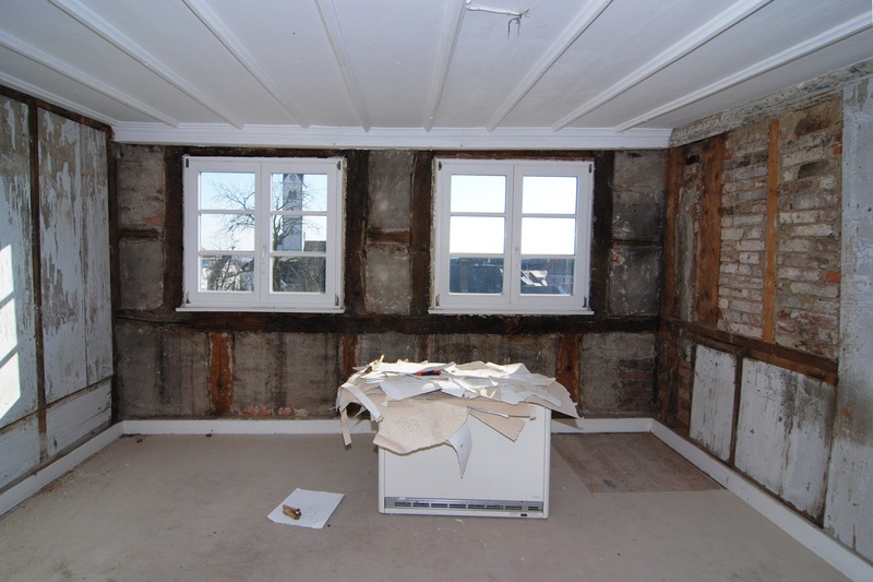 Erneuerung der Raumschale, Befensterung, Wandeinbauten, Kamineinbau.