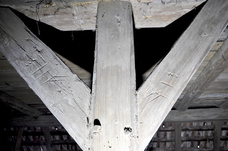 Der südliche Wandständer mit leeren Zapfenlöchern in Kombination mit den ausgenommenen Zapfenlöchern im Kehlbalken weist nach, dass die Wand über die gesamte Breite durchlief. Im Zuge des späteren Ausbaus wurde der Wandständer aufgedoppelt, sodass die jüngere Wand autark ist.