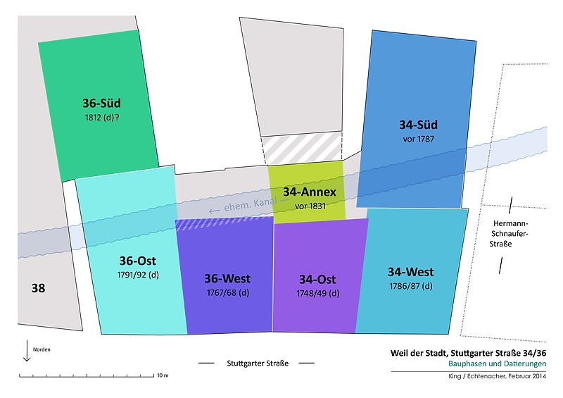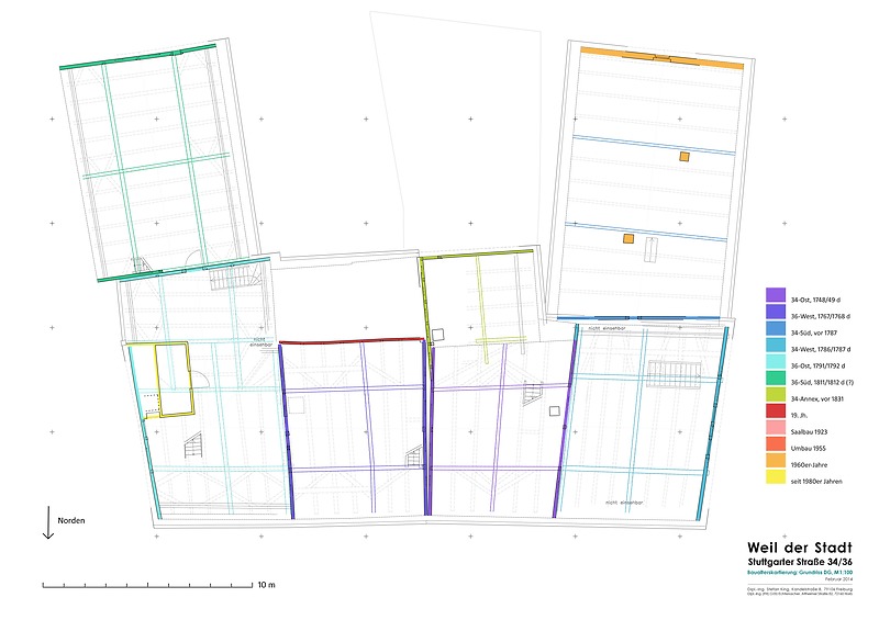 Davon wurden fünf Dachwerkabschnitte mit Hilfe dendrochronologischer Altersbestimmung datiert und weisen eine Entstehung innerhalb weniger Jahrzehnte nach, an dessen Anfang 1749 der Kernbau des Vorderhauses Nr. 34 steht (34-Ost). Das jüngste Datum lieferte das Hinterhaus von Nr. 36 (36-Süd), das gesichert nach 1792 und nach nicht abgesichertem Dendro-Datum um 1812 entstanden ist. Die Errichtung des Hinterhauses von Nr. 34 (34-Süd) lag irgendwann vor 1787. Erweiterung (34-Annex) und Hintergebäude von Nr. 34 sind auf der 1831 erstellten Urkarte bereits dargestellt. Die in kurzer Zeitfolge entstandenen Dachwerke sind alle mit liegendem Stuhl abgezimmert, zeigen dabei aber eine große Variationsbreite bezüglich der Lösung ihrer Längsaussteifung.