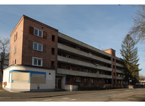 Die 32 Standard-Zwei-Zimmer-Wohnungen sind in den Bauteilen dazwischen untergebracht. Auf der Nordseite wird der Mittelrisalit nur durch das Treppenhaus gebildet, für den Zugang zum Dach wird es ein Geschoss höher geführt. Die turmähnliche Erscheinung wird durch drei schlitzartigen Öffnungen im obersten Geschoss betont.