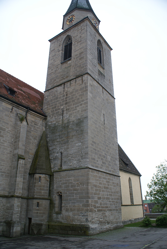 Im Laufe des 15. Jahrhundert wurden Chor und Langhaus der ehemaligen Michaelskirche sukzessive durch Neubauten ersetzt. Ihre unterschiedliche Entstehungszeit ist den Bauteilen bereits von außen deutlich anzusehen. Dem schlichten, als Putzbau mit Eckquaderung errichteten Langhaussaal stehen die grauen Sichtquader der älteren Ostteile gegenüber. Bestätigt wird dies durch die Aufnahme der Steinmetzzeichen, die eindeutig zwei unterschiedlichen Bauhütten angehören. Das Fehlen von Strebepfeilern am Langhaus weist zudem auf eine unterschiedliche Deckung der einzelnen Räume hin. Tatsächlich war das Langhaus trotz seiner großen Breite von Beginn an flach gedeckt, während Chor und Turm ein Rippengewölbe erhielten.