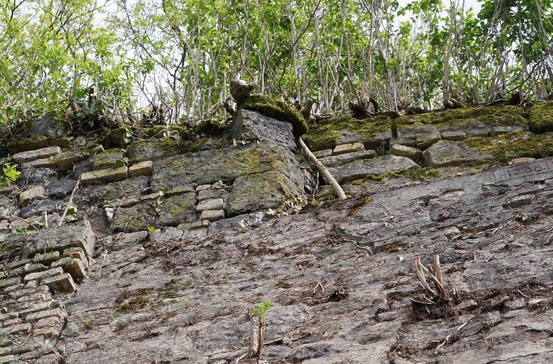 Es ist zu vermuten, dass der Burgberg aus verwitterungsanfälligem Tuff gebildet ist, so dass vertikale Flächen aus Mauerwerk hergestellt werden mussten. Auf diese Weise wären die beindruckend hohen vertikalen oder leicht geböschten Mauern um die Oberstadt herum zu erklären und warum sie meist keinen Überhang aufweisen, wie man ihn bei Stützmauern vor loser Schüttung erwarten würde. Die Mauer wurde vermutlich dicht vor den Abgeschroteten Felsen gesetzt oder sogar mit diesem verzahnt.
