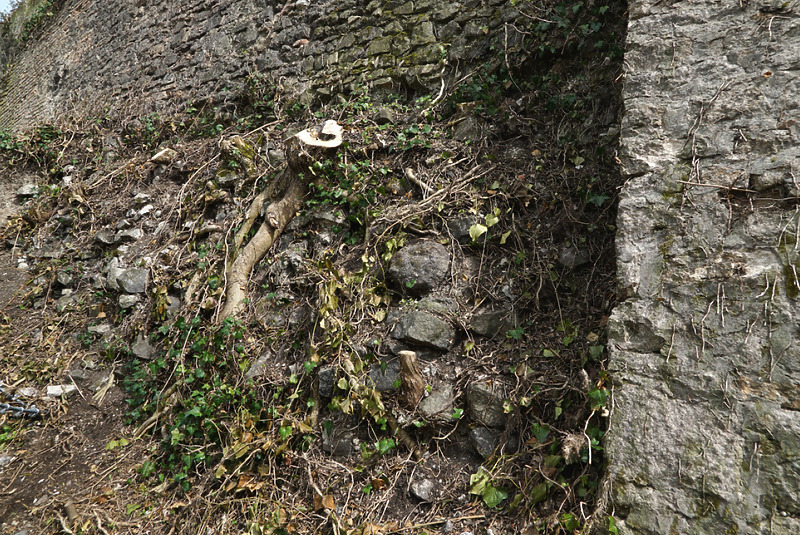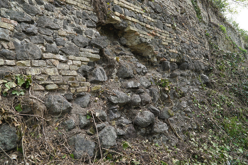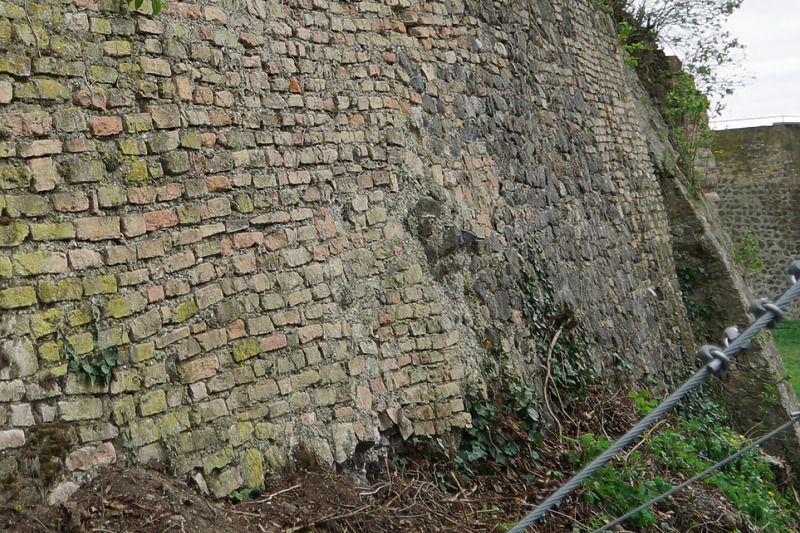 Unten vortretende Steinsetzung, darüber Ausbruch der Außenschale / Stadtmauer in 79206 Breisach, Breisach am Rhein (12.2021 - S. King)