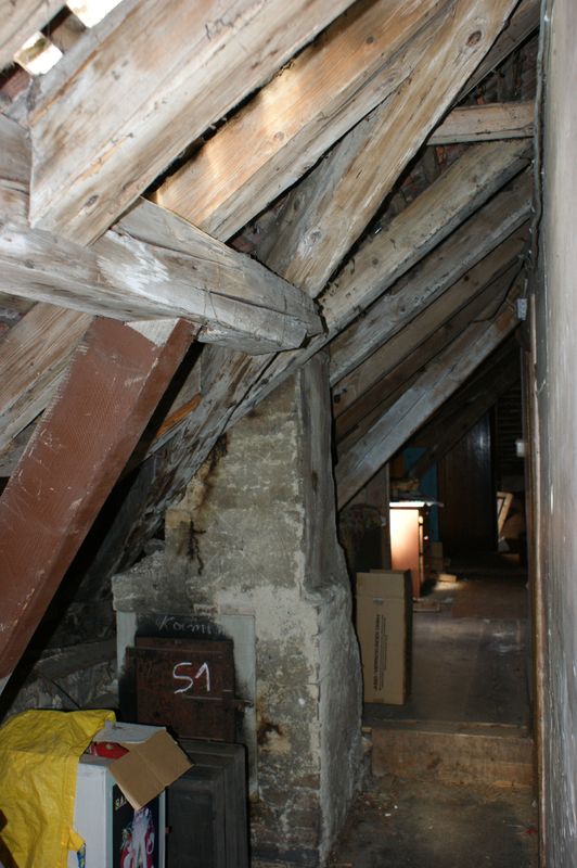 In Anlehnung an das barocke Treppenhaus ist dem vorhandenen Dachwerk eine ältere, zumindest ins 18. Jh. zu datierende Situation vorausgegangen. Dafür spricht auch der Vorsprung an der östlichen Traufwand.