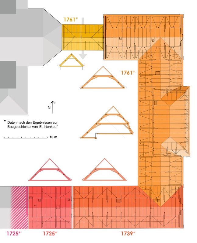 An dieses früheste Dach wurde ein kurzer Dachwerksabschnitt in einer Länge von nur drei Querzonen angefügt. Die aus der Baugeschichte abzuleitende Datierung dieses Dachwerks fällt ebenfalls ins Jahr 1725*