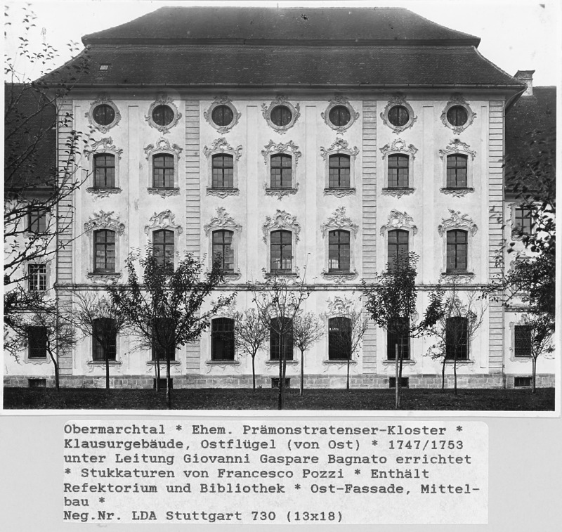 Die Klosteranlage Obermarchtal schließt sich im Osten an die ehem. Prämonstratenser-Abteikirche St. Peter und Paul an. Die streng symmetrische, vierseitig um einen Innenhof gruppierte Anlage wurde ganz nach der Konzeption von Ch. Thumb und F. Beer erbaut. Im Anschluss an den Kirchenbau entstand 1701-03 der Westflügel. Daran setzte 1703 der Bau der westlichen Hälfte des Konventbaus im Norden an. 1737 wurde unter Josef Benedikt und Martin Schneider der Südteil angelegt. Unter Johann Caspar Bagnato erfolgte 1747-53 der Weiterbau an Nord- und Ostflügel in der Achse der Kirche. 1769 entstand anlässlich der Durchreise von Dauphine Marie Antoinette der südöstliche Pavillon, der sog. Dauphine-Bau.
