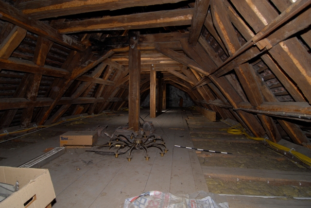 Im 1. DG ist die Dachkonstruktion durch einen modernen Dachausbau weitgehend verkleidet. Freiliegende Stuhlsäulen und -streben zeigen jedoch eine seitliche liegenden Stuhlkonstruktion mit fünf innen liegenden Stuhlquerbünden, die sich sowohl über den Hauptbaukörper als auch über den südseitigen Treppenhausvorbau erstreckt. In der Mittellängsachse des Dachwerks befindet sich ein Mittellängsbund mit Überzug und bis zum First emporreichenden, mit dem Überzug durch breite Eisenbänder verbundenen Hängesäulen. Hierdurch wird die gesamte Dachbalkenlage nach oben in das Dachwerk gehängt und damit für das zweite Obergeschoss eine vollkommen vom Dachbereich unabhängige Grundrissgliederung wie auch die einst dort vorgenommene Einrichtung des großen Theatersaals ermöglicht.
