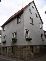 Dreigeschossiges verputztes Wohnhaus in Ecklage, Erdgeschoss massiv aus Quadersteinen unverputzt, Satteldach, 1884 weitgehend neu erbaut.