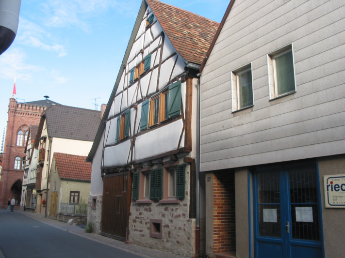 massiver Erdgeschosszone und darüber aufgehendem - inzwischen freigelegtem - Fachwerk.