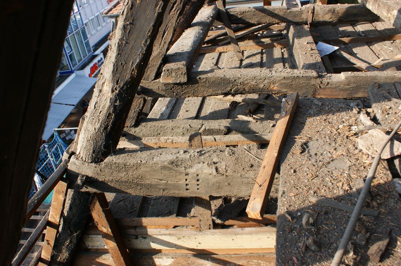 Der Restbestand der liegenden Stuhlkonstruktion konnte ansatzweise im ehemaligen Gebinde Nr.7 aufgenommen werden (Querschnitt Dachwerk). Während es sich im 1. Dachgeschoss um einen klassischen liegenden Stuhl handelt, ist im 2. Dachgeschoss eine davon abweichende Konstruktion ausgeführt. Streng genommen handelt es sich um eine lokale Unterstützung des Kehlbalkens, bei der die lokal auftretenden Lasten über angeblattete Kopfbänder in die Sparren eingeleitet werden sollten. Die gleiche Ausführung konnte auch für das Gebinde Nr. 6 aufgenommen werden. Die aufzunehmenden Lasten resultieren bzw. resultierten zum einen aus dem unteren Längsholz, zum anderen aus den drei oberen Längshölzern. Während das untere Holz die gesamte Dachlänge durchzieht und über angeblattete Kopfbänder vorrangig die Längsaussteifung übernehmen sollte, sind die Längen der oberen Hölzer auf die Distanz zwischen den beiden Sparrenpaaren beschränkt und dienten ursprünglich als Gründungsebene für einen ehemals hier aufgesetzten, später entfernten Dachreiter.