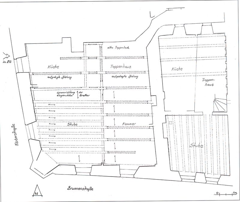 Die für den ältesten erkannten Baukörper ermittelten Daten stammen aus den dendrochronologischen Untersuchungen an den im 1. Obergeschoss erhaltenen Deckenkonstruktionen. Die unterschiedlichen Deckenausbildungen unterteilen den erhaltenen Grundrissabschnitt in einen rückwärtigen Küchen- und Treppenhausbereich und in den vorderen zur Brunnenstraße ausgerichteten Stubenabschnitt.